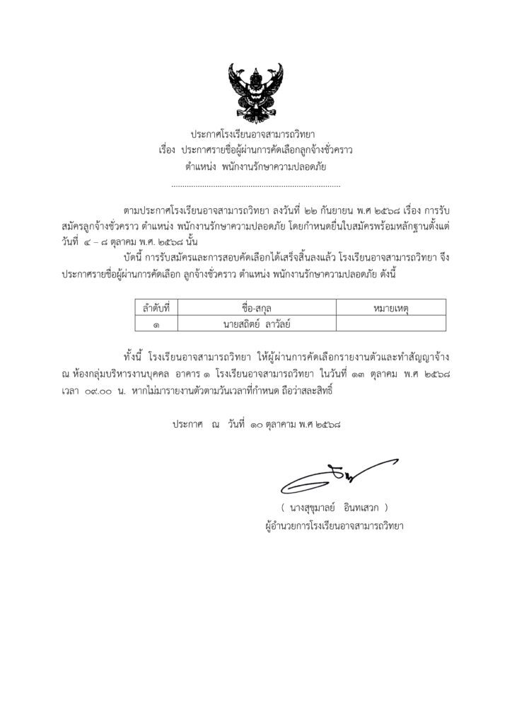 ประกาศผลการคัดเลือกบุคคลเพื่อจ้างเป็นลูกจ้างชั่วคราว ตำแหน่ง พนักงานรักษาความปลอดภัย แสดงความคิดเห็น / ประกาศโรงเรียน / โดย: จันทร์เพ็ญ พรมชินวงศ์