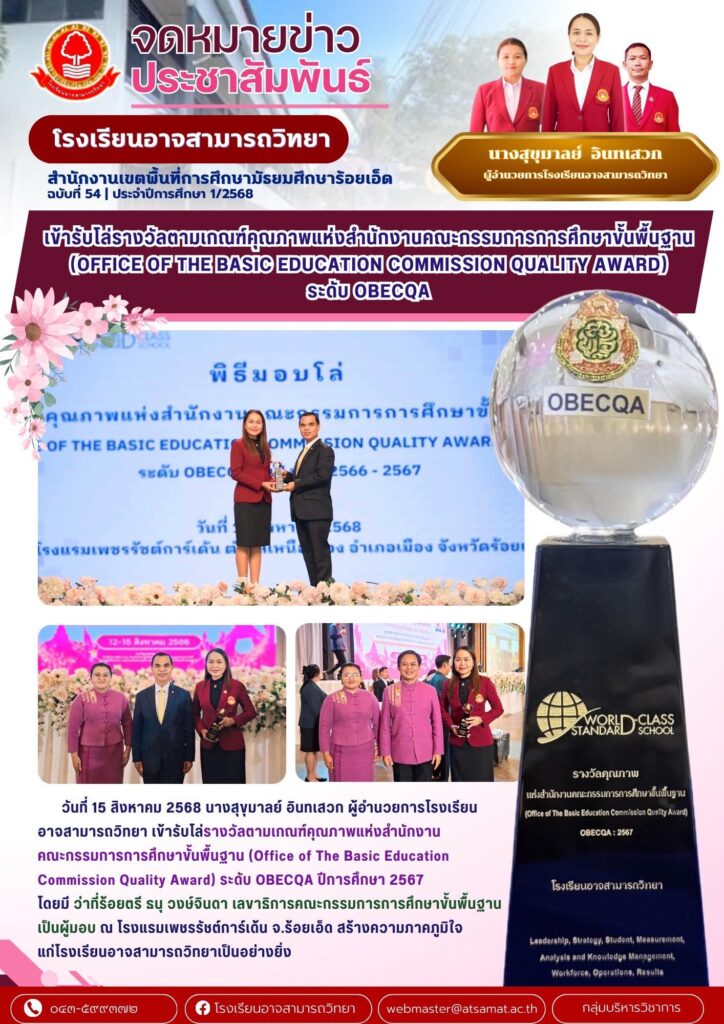 ผู้อำนวยการโรงเรียนอาจสามารถวิทยา เข้ารับโล่รางวัลตามเกณฑ์คุณภาพแห่งสำนักงานคณะกรรมการการศึกษาขั้นพื้นฐาน